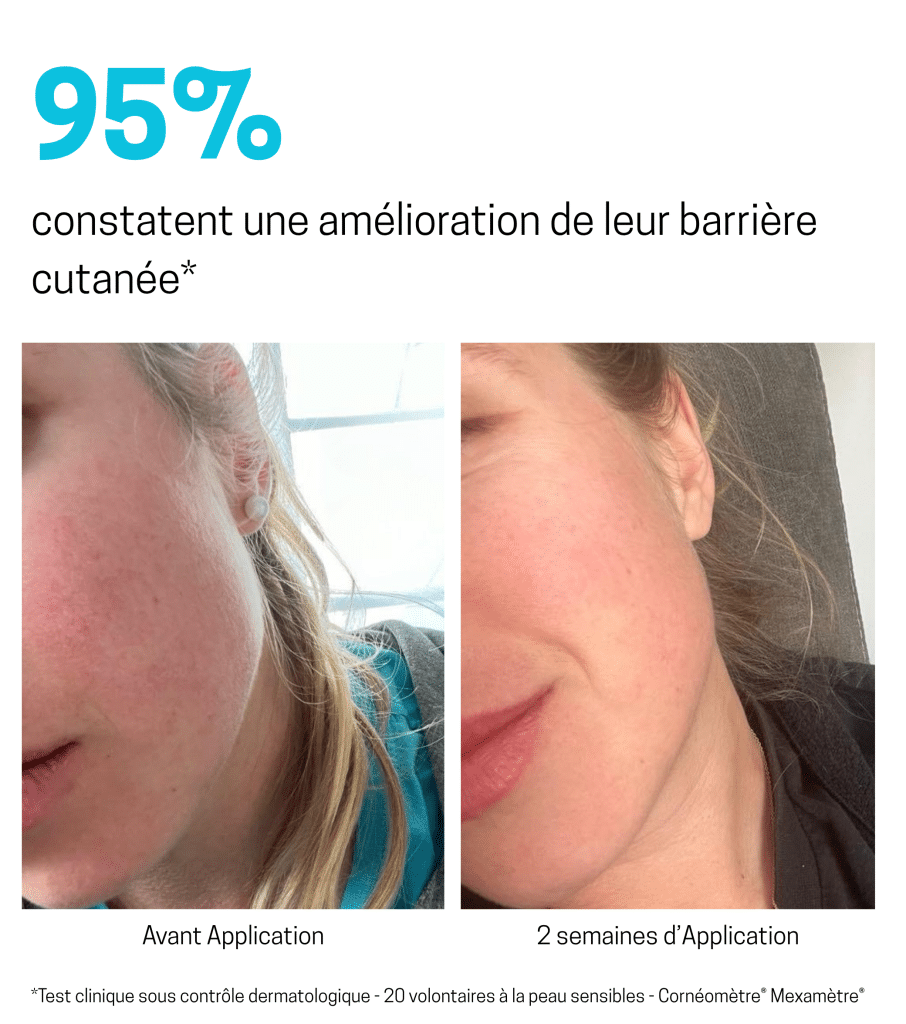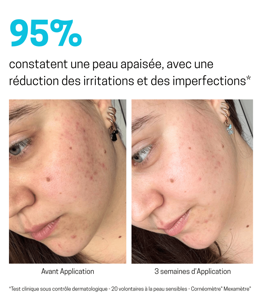 Test clinique réalisé sur 20 volontaires à peau sensible après 28 jours d’utilisation.