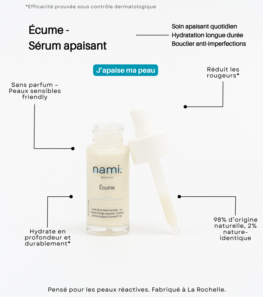 Le sérum Écume apaise les rougeurs, réduit les imperfections et soulage les tiraillements des peaux sensibles et réactives, dès les premières applications.